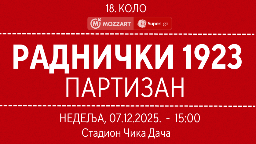 Фудбалери Радничког 1923 у суботу на стадиону „Чика Дача“ дочекују екипу Партизана у оквиру 18….